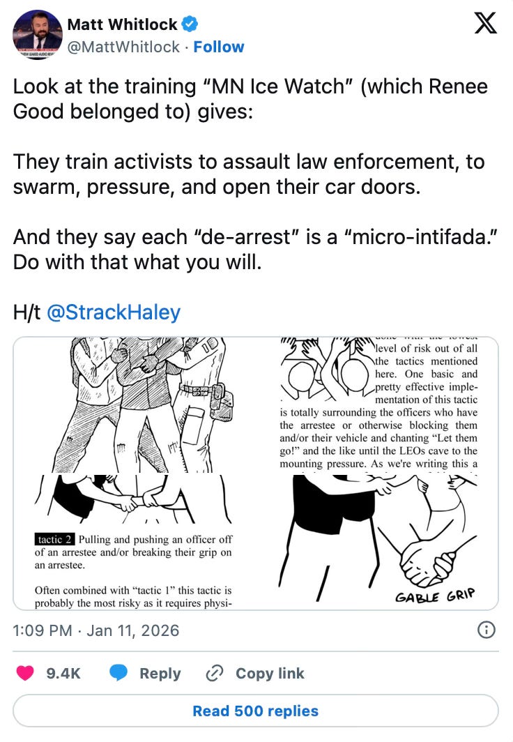 “MN ICE Watch,” an Instagram page, shared screenshots from a “de-arrest” primer, which gives agitators advice on how to prevent law enforcement officers from taking someone into custody.